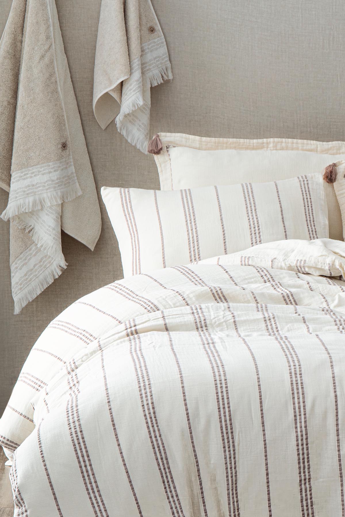 Doğal dokunuşunu modern çizgilerle birleştiren İzgi Nevresim Takımı, yatak odanıza sade bir şıklık ve zarafet katmak için ideal bir seçimdir.